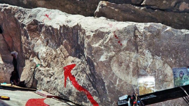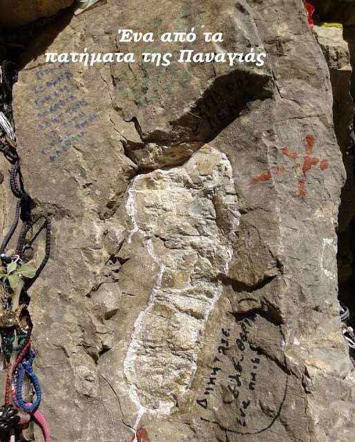 Τὰ «Πατήματα τῆς Παναγίας» ἀλλὰ καὶ την εικόνα της, συναντάει ὁ ἐπισκέπτης στὸ μονοπάτι ποὺ ὁδηγεῖ στὴ Μονὴ Προυσοὺ στὸ Καρπενήσι.