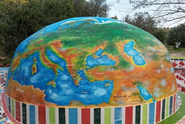 «Υπάρχει ζωγραφισμένος ο παγκόσμιος χάρτης σε πραγματική κλίμακα από έναν φίλο ζωγράφο εθελοντή. Την πυραμίδα την έφτιαξα εμπνευσμένος από την Αίγυπτο. Η πυραμίδα στο εσωτερικό της έχει χώμα, έχει ειδική κατασκευή με πλέγμα και τσιμέντο και πάνω εκεί έχουν τοποθετηθεί τα πλακάκια. Η κάθε βάση της πυραμίδας έχει διαφορετικό θέμα», λέει ο Στράτος Μαυρίδης.